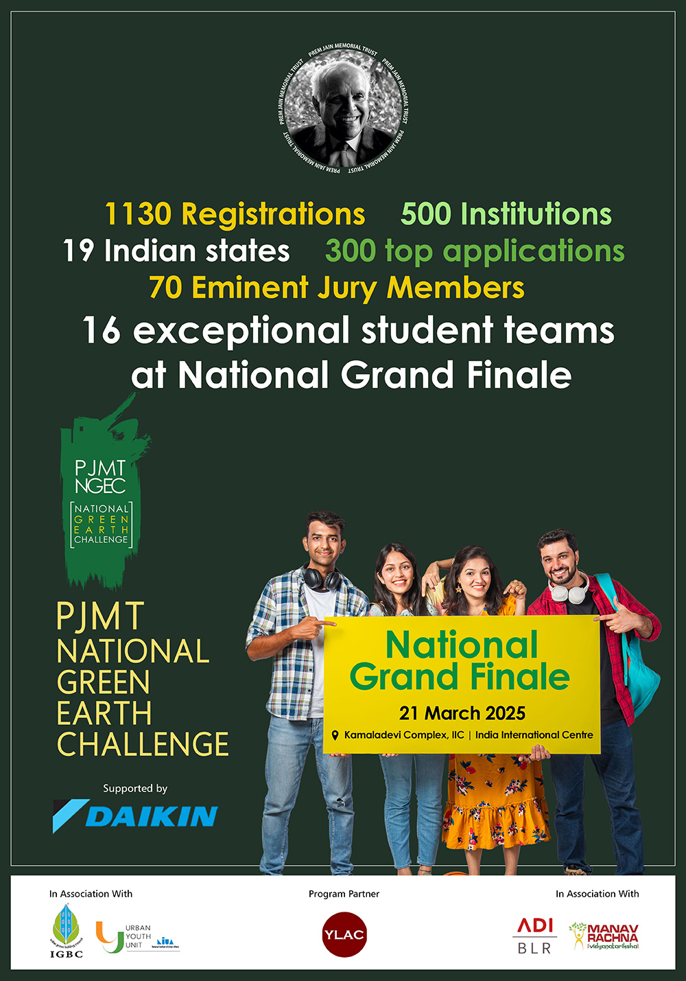 Prem Jain Memorial Trust is organizing National Green Earth Challenge in collaboration with Young Leaders for Active Citizenship, Indian Green Building Council and The National Institute of Urban Affairs to ensure reaching a far and wide audience in a meaningful way.